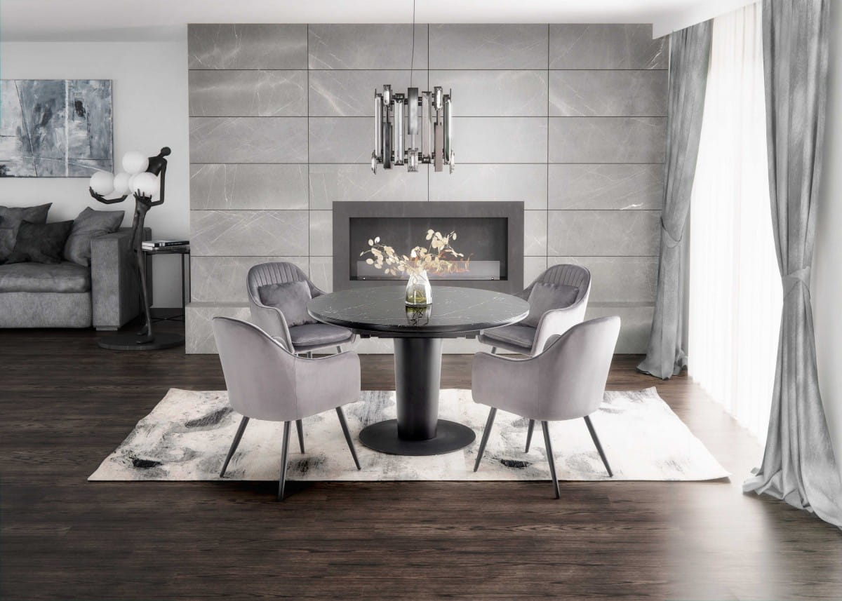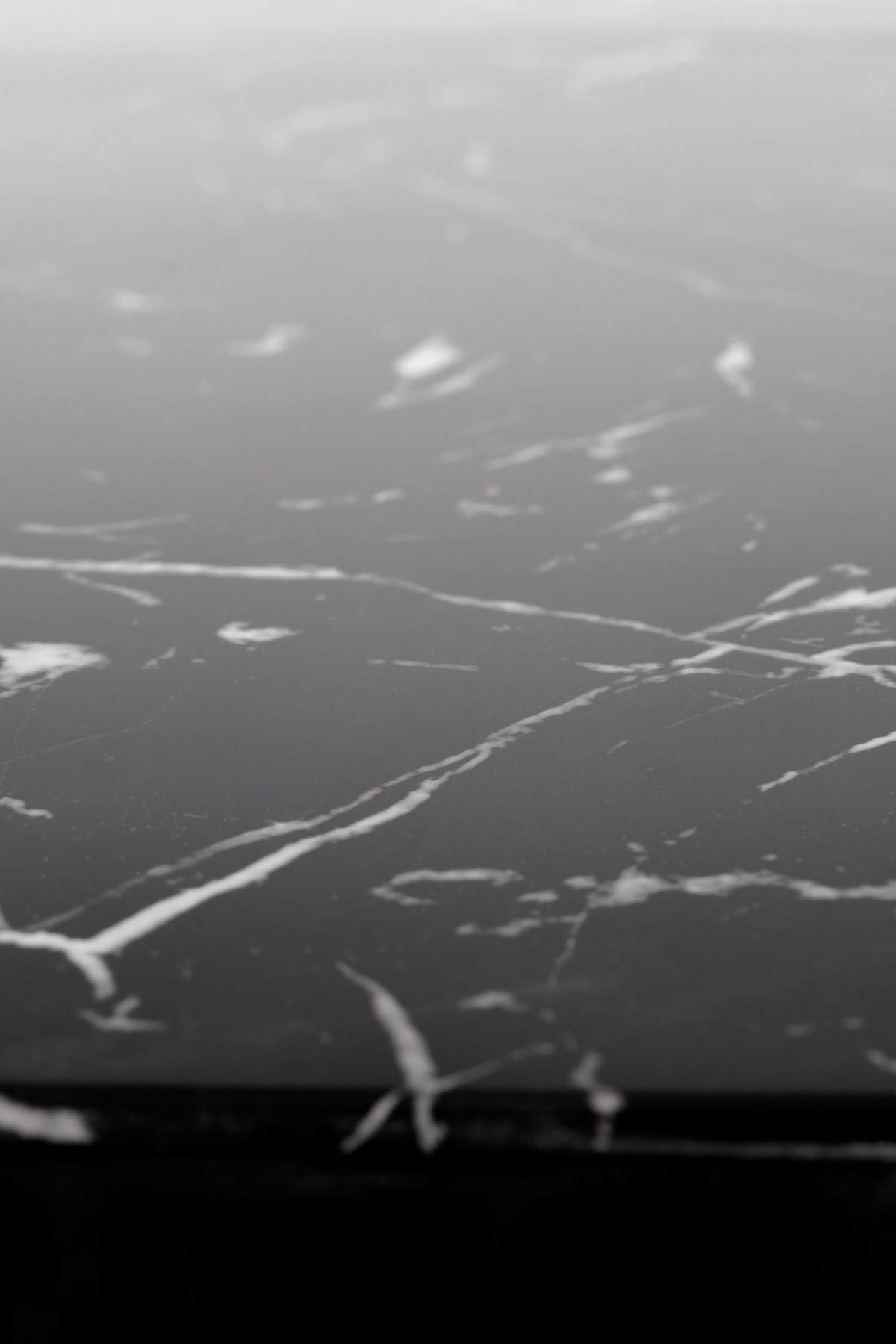 Stół Cristiano to doskonałe połączenie funkcjonalności i stylu. Jego blat, wykończony efektem czarnego marmuru, nadaje wnętrzu elegancji i luksusu, a konstrukcja z lakierowanego MDF i proszkowo malowanej stali gwarantuje trwałość i stabilność.