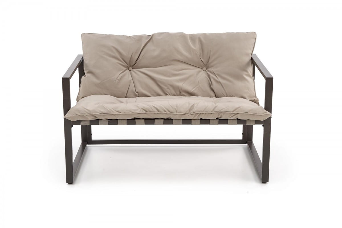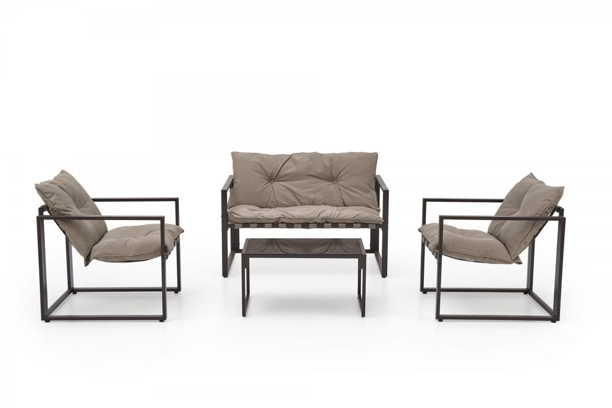 Konstrukcja mebli została wykonana z stali malowanej proszkowo, co zapewnia trwałość i odporność na warunki atmosferyczne. Zarówno sofy, jak i fotele pokryte są miękką tkaniną w kolorze cappuccino, która doda elegancji każdemu wnętrzu. Dodatkowo, zestaw zawiera szklaną ławę - idealne miejsce na kawę czy ulubioną książkę podczas letnich dni.