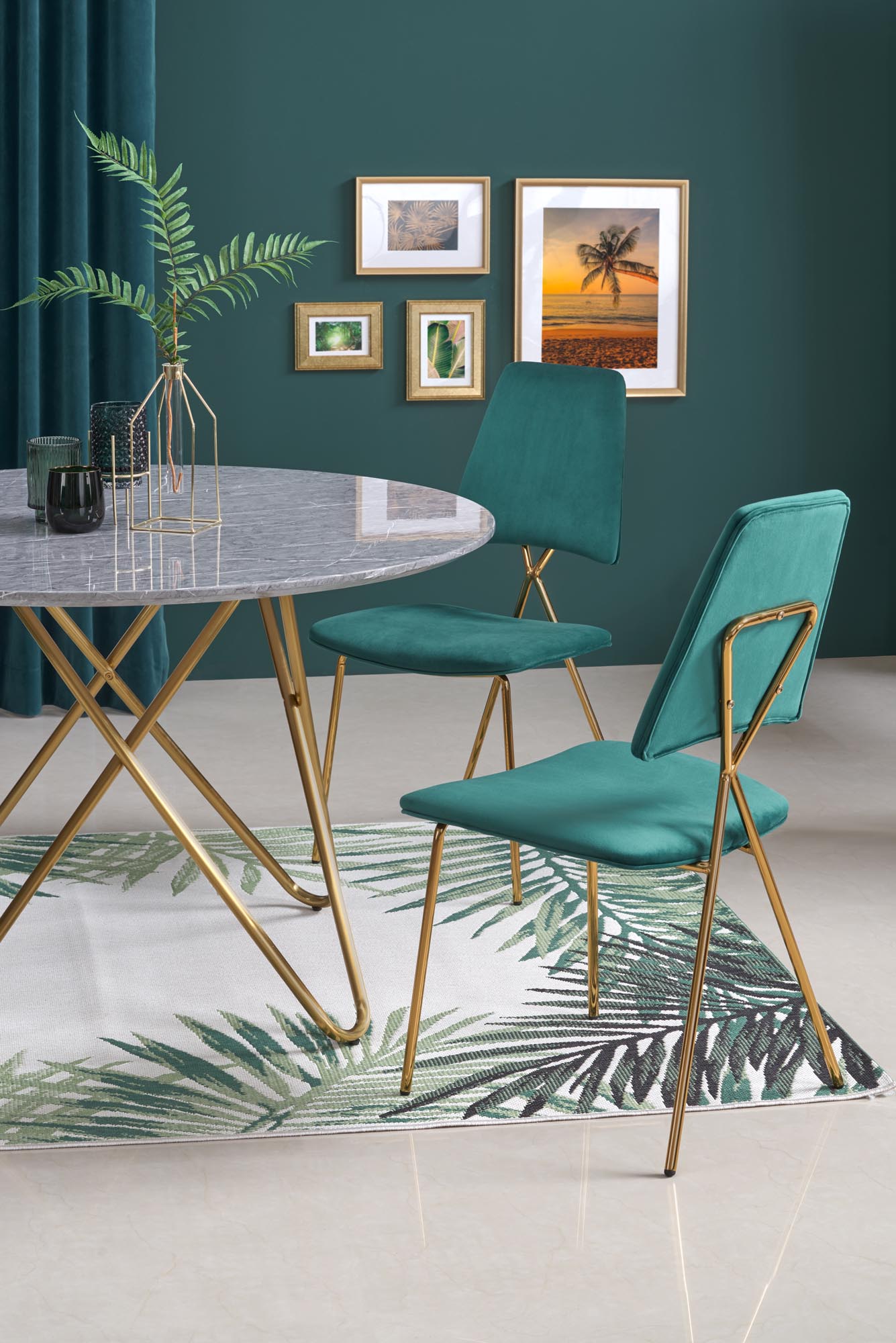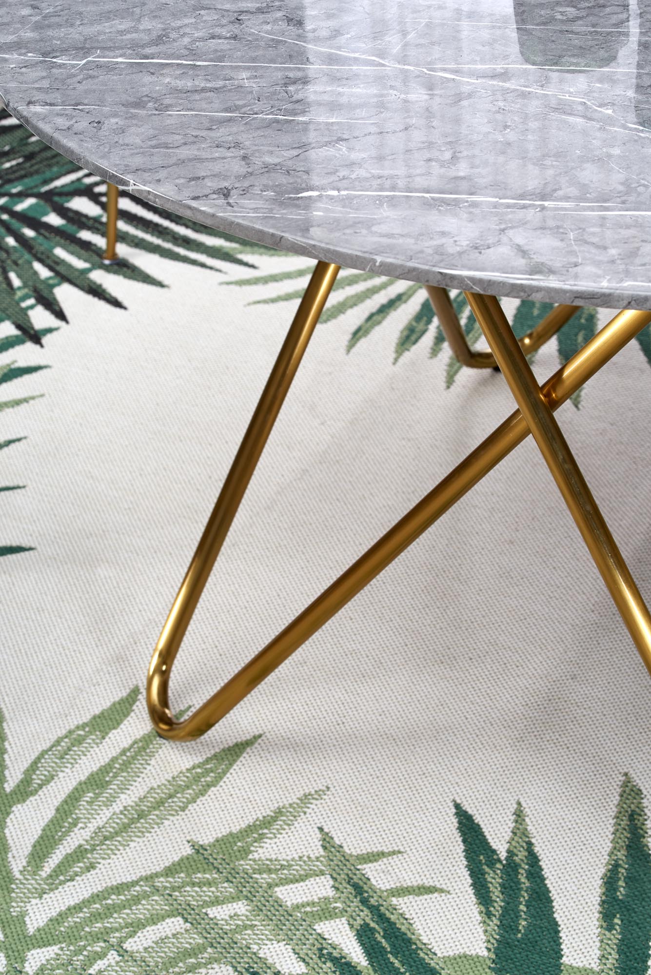 - Nogi - złoty: Złote nogi stołu dodają całości szlachetności, stanowiąc doskonałe tło dla popielatego blatu z efektem marmuru.