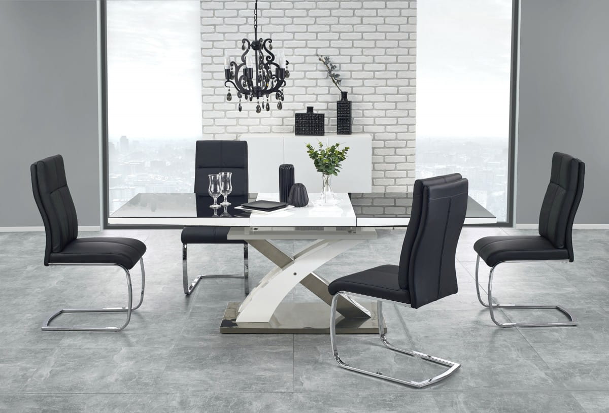- Nowoczesność i Styl: Czarny blat ze szkła w połączeniu z bielą MDF lakierowanego tworzy niepowtarzalny i wyrafinowany design Stołu Halmar SANDOR 2.